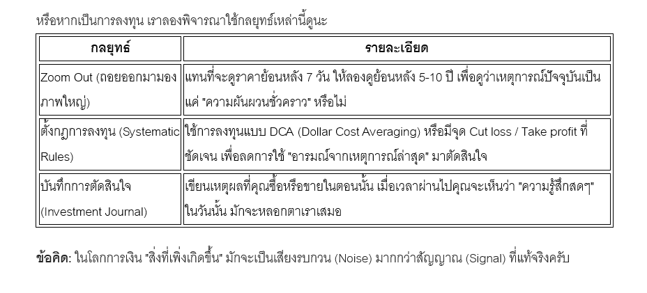ข้อคิด: ในโลกการเงิน “สิ่งที่เพิ่งเกิดขึ้น” มักจะเป็นเสียงรบกวน (Noise) มากกว่าสัญญาณ (Signal) ที่แท้จริงครับ