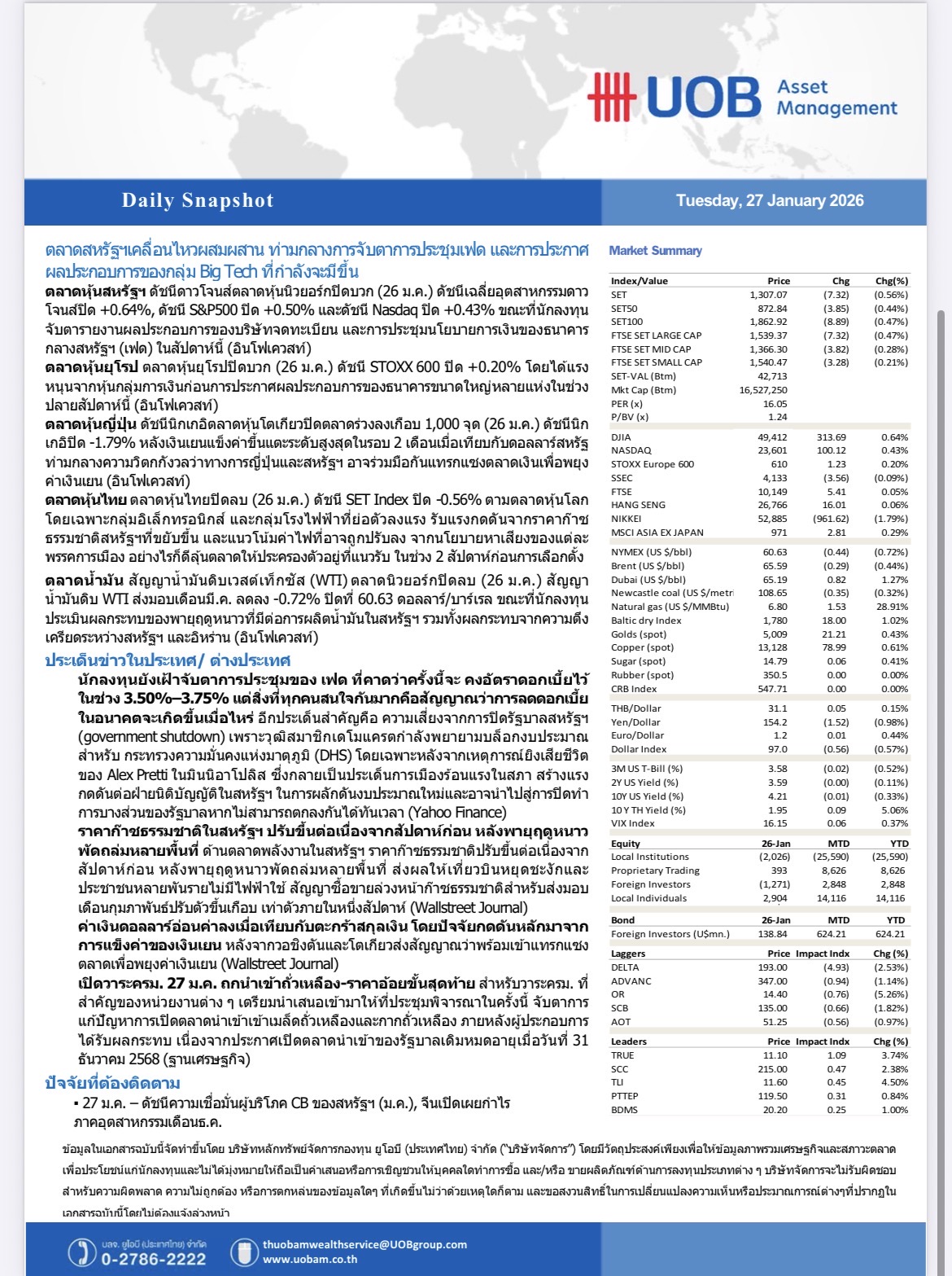 UOBAM : ตลาดสหรัฐฯเคลื่อนไหวผสมผสาน จับตาเฟด-งบกลุ่ม Big Tech 27/01/2026 09:49009Breaking News, Fund Manager HoonSmart.com>> UOBAM Daily Snapshot : ตลาดสหรัฐฯเคลื่อนไหวผสมผสาน ท่ามกลางการจับตาประชุมเฟด และผลประกอบการของกลุ่ม Big Tech Screenshot Facebook iconFacebookTwitter iconTwitterLINE iconLine