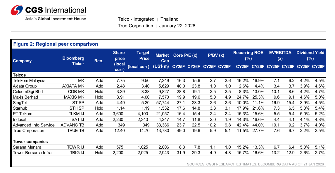 ฝ่ายวิเคราะห์หลักทรัพย์ CGSI ยังแนะนำ “ซื้อ” หุ้น TRUE เพราะกำไรสุทธิมีแนวโน้มฟื้นตัวในปี 68 และคาดจะเติบโตสูงถึง 151% ในปี 69 ส่วนราคาเป้าหมายยังคงอยู่ที่ 14.70 บาท โดย TRUE จะประกาศผลประกอบการไตรมาส 4/68 และปี 68 ในวันที่ 19 ก.พ.69 นี้