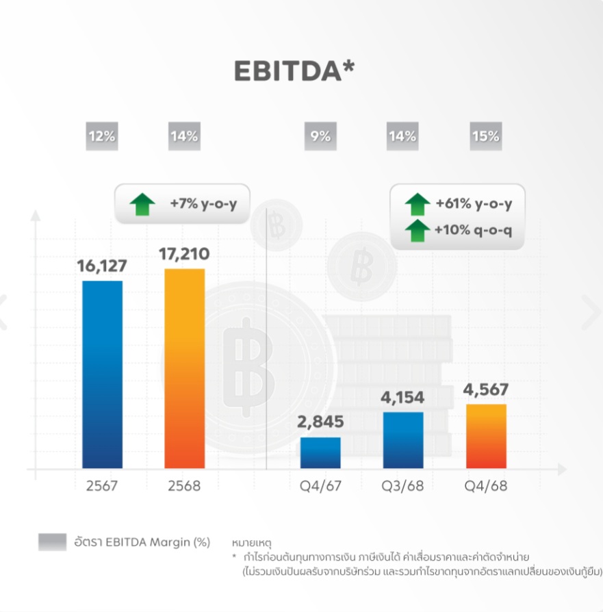 สำหรับผลการดำเนินงานไตรมาส 4 ปี 2568 มีรายได้จากการขาย 30,170 ล้านบาท ลดลง 3% เมื่อเทียบกับช่วงเดียวกันของปีก่อน มี EBITDA 4,567 ล้านบาท เพิ่มขึ้น 61% เมื่อเทียบกับช่วงเดียวกันของปีก่อน และกำไรสำหรับงวด 1,206 ล้านบาท เพิ่มขึ้นเมื่อเทียบกับช่วงเดียวกันของปีก่อน เนื่องจากมีกำไรส่วนเพิ่มจากการซื้อกิจการ MYPAK สะท้อนการลงทุนที่มีประสิทธิภาพ