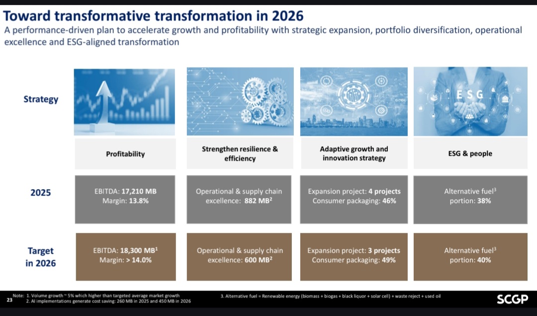 รวมถึงวางกลยุทธ์เพิ่มประสิทธิภาพการผลิตและบริหารต้นทุน ด้วยการนำเทคโนโลยีหุ่นยนต์ (Robot) หุ่นยนต์เพื่อทำงานร่วมกับพนักงาน (Cobot) และระบบอัตโนมัติมาใช้ในกระบวนการผลิต เพื่อการควบคุมคุณภาพบรรจุภัณฑ์ได้อย่างแม่นยำ ช่วยจัดการวัตถุดิบและลดต้นทุน และส่งมอบสินค้าที่ได้คุณภาพให้ลูกค้า โดยจะมีการขยายการใช้งานในโรงงานต่างประเทศเพิ่มขึ้น อีกทั้งยังเดินหน้าบริหารต้นทุนต่อเนื่อง เช่น ธุรกิจในอินโดนีเซียได้ปรับสัญญาการใช้พลังงาน ซึ่งจะเริ่มเห็นผลของการลดค่าใช้จ่ายตั้งแต่มกราคม ปี 2569