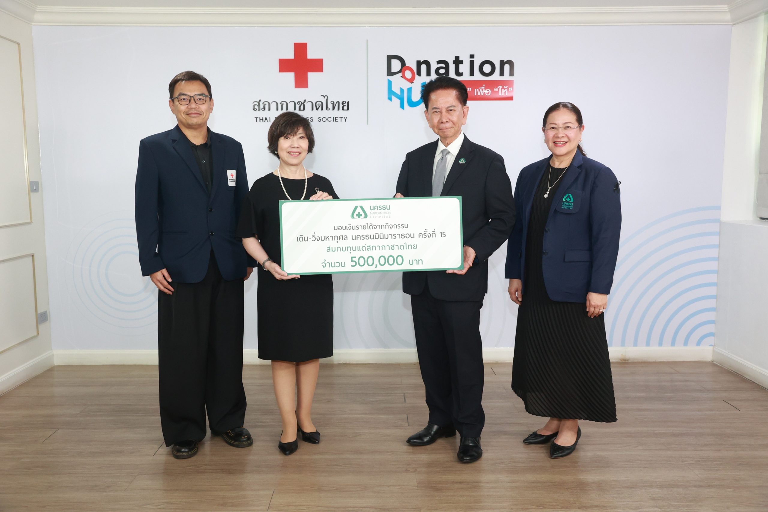 รศ.ญาณเดช ทองสิมา (ที่ 2 จากขวา) ประธานกรรมการ , นางสาวเยาวเรศ ทองสิมา (ขวา) ผู้อำนวยการสายงานบริหาร บริษัท โรงพยาบาลนครธน (NKT) มอบเงินรายได้จากการจัดกิจกรรมเดิน-วิ่งมหากุศล นครธนมินิมาราธอน ครั้งที่ 15 ภายใต้แนวคิด “วิ่งด้วยความรัก เพื่อสภากาชาดไทย : Save The World” จำนวน 500,000 บาท โดยมีนางจันทร์ประภา วิชิตชลชัย (ที่ 2 จากซ้าย) รองผู้อำนวยการสำนักงานจัดหารายได้ สภากาชาดไทย ให้เกียรติเป็นผู้รับมอบในครั้งนี้
