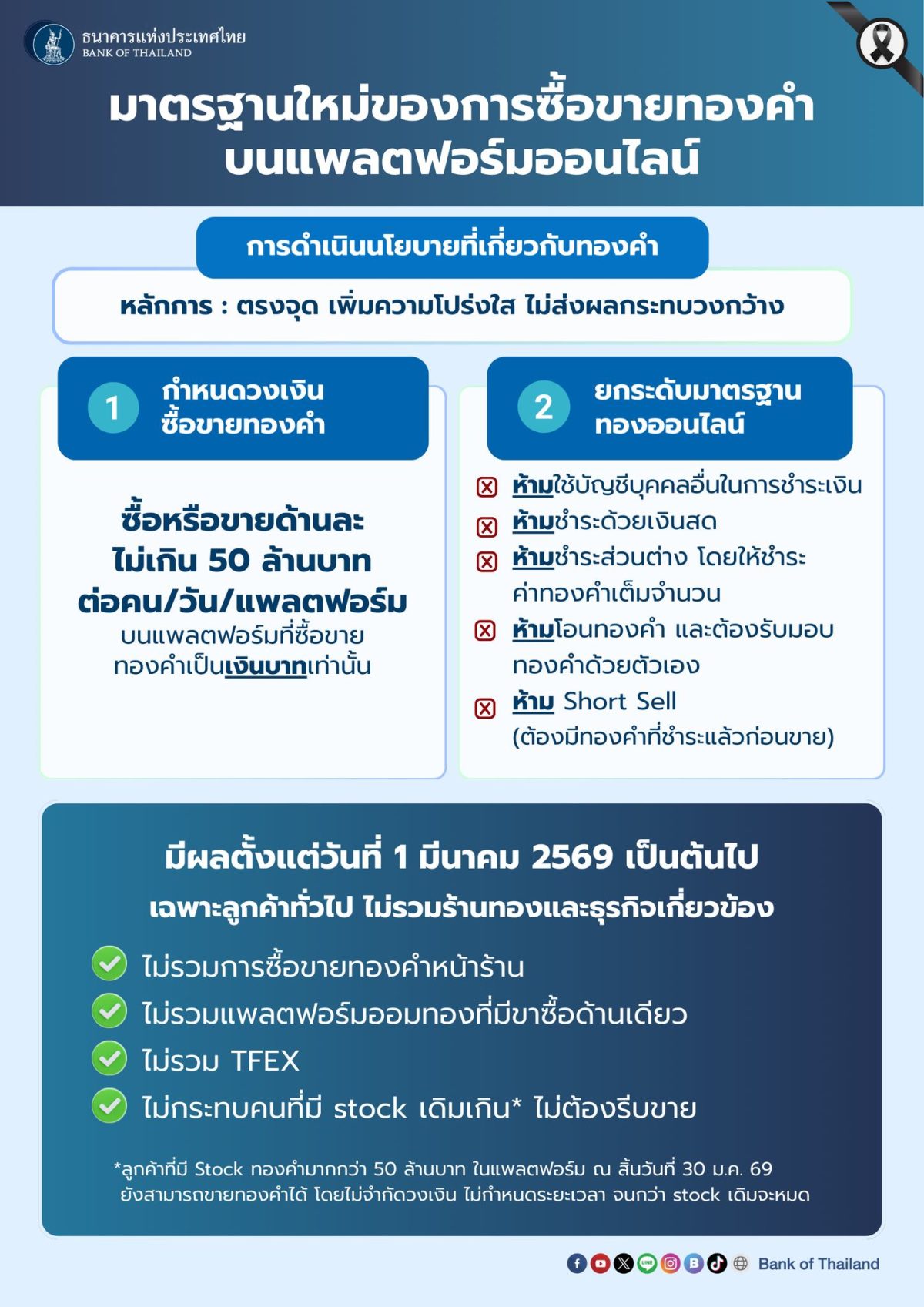 ธปท. คุมทองออนไลน์!จำกัด 50 ลบ. ลดเสี่ยงค่าเงินบาทผันผวนบังคับ 1 มี.ค.69