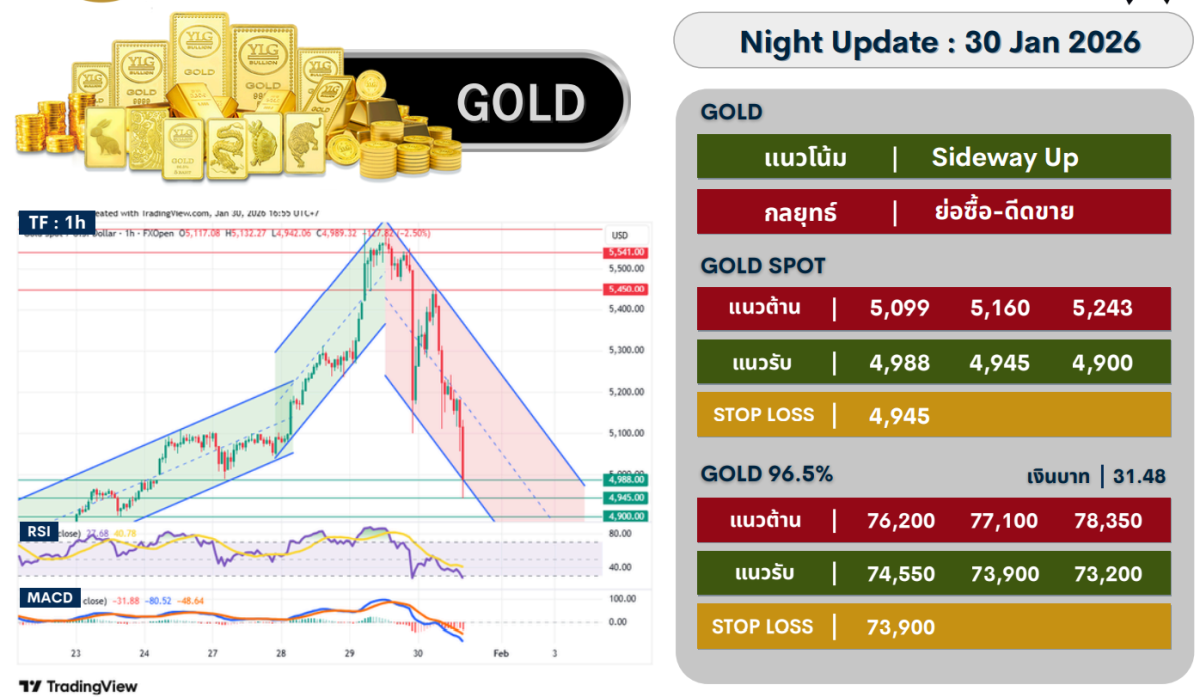 ตัดขาดทุน หากราคาหลุด4,945 ดอลลาร์ต่อออนซ์ ขายทำกำไร หากไม่ผ่าน 5,099 – 5,143 ดอลลาร์ต่อออนซ์