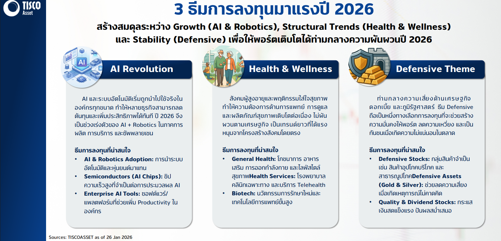 สำหรับมุมมองการลงทุนในปี 2569 บลจ. ทิสโก้มอง 3 ธีมลงทุนที่เพิ่มโอกาสสร้างผลตอบแทนที่ดี คือ 1. ธุรกิจที่เกี่ยวข้องกับ AI และระบบอัตโนมัติ เพราะเริ่มเห็นการนำไปใช้จริงในองค์กรทุกขนาด เพื่อลดต้นทุนและเพิ่มประสิทธิภาพการผลิตและการให้บริการ