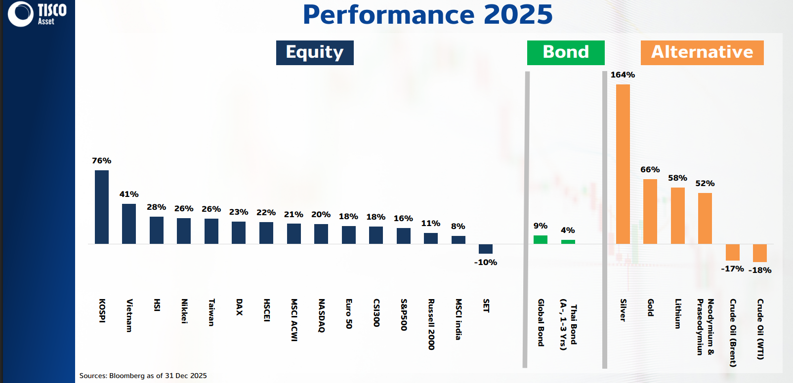 นายสุพงศ์วร เมี้ยนโภคา ผู้ช่วยกรรมการผู้จัดการ บริษัทหลักทรัพย์จัดการกองทุน (บลจ.) ทิสโก้ จำกัด (TISCOASSET) เปิดเผยว่า บลจ.ทิสโก้มองภาพรวมการลงทุนปี 2569 แนวโน้มให้ผลตอบแทนที่ดีเช่นเดียวกับปีที่ผ่านมา นโยบายการเงินของธนาคารกลางทั่วโลกอยู่ในระดับที่ผ่อนคลาย กำไรบริษัทจดทะเบียนส่วนใหญ่ยังเติบโตได้ดีโดยเฉพาะกลุ่มที่เกี่ยวข้องกับธุรกิจ AI เศรษฐกิจทั่วโลกยังคงขยายตัวได้ดี และสหรัฐฯ เริ่มผ่อนคลายกฎเกณฑ์ในการดำเนินธุรกิจ แต่ก็ยังมีความเสี่ยงจากภาษีการค้าและความไม่แน่นอนของนโยบายการค้าระหว่างประเทศของสหรัฐฯ รวมถึงความเสี่ยงเชิงภูมิรัฐศาสตร์ และมูลค่าหุ้น (Valuation) หลายตลาดอยู่ในระดับสูง