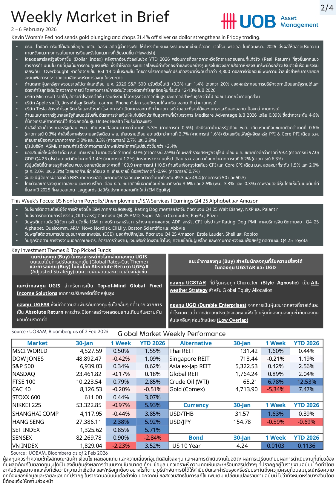 UOBAM Weekly Market in Breif : ราคาทองคำ-เงินร่วงหลังทรัมป์เสนอชื่อประธานเฟดคนใหม่ 03/02/2026 15:2303/02/2026 15:34009Breaking News, Fund ManagerUOBAM HoonSmart.com>> UOBAM Weekly Market in Breif (2-6 ก.พ.) สัปดาห์นี้ติดตามตัวเลขจ้างงานนอกภาคเกษตร-ว่างงาน-ภาคบริการ ISM สหรัฐฯ-ผลประกอบการ Q4/68 ของ Alphabet , Amazon หลังจากสัปดาห์ก่อนหน้า ราคาทองคำ-เงินร่วงหลังทรัมป์แต่งตั้งประธานเฟดคนใหม่ Facebook iconFacebookTwitter iconTwitterLINE iconLine