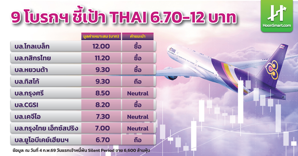 ทางด้าน 9 โบรกเกอร์ ชี้เป้าราคาหุ้น THAI อยู่ในช่วง 6.70-12 บาท โดยบล.โกลเบล็กตีมูลค่าสูงสุด 12 บาท ส่วนบล.ยูโอบีเคย์เฮียน (ประเทสไทย) ให้ต่ำเพียง 6.7 บาท แนะนำถือ