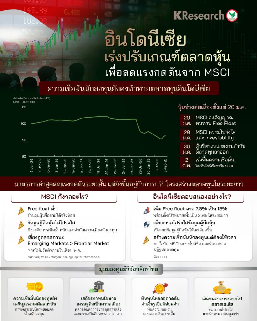 ศูนย์วิจัยกสิกรไทย เผย MSCI ตั้งข้อกังวลต่อโครงสร้างตลาดหุ้นอินโดนีเซีย (28 ม.ค. 2026) โดยเฉพาะระดับ Free Float ที่ต่ำและความโปร่งใสโครงสร้างผู้ถือหุ้น ซึ่งอาจกระทบความสามารถในการลงทุนและสถานะตลาดในดัชนีโลก ส่งผลให้ตลาดหุ้นอินโดนีเซียปรับตัวลดลงต่อเนื่องนับตั้งแต่เริ่มมีสัญญาณการทบทวนเกณฑ์ของ MSCI
