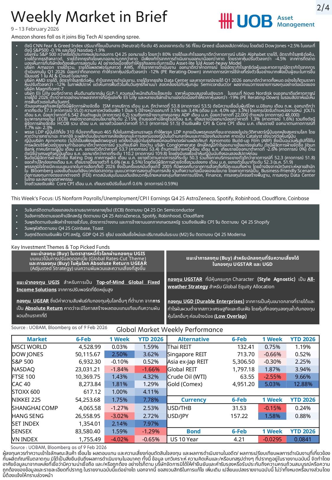 UOBAM Weekly Market in Brief : สัปดาห์นี้ติดตามจ้างงานนอกภาคเกษตรสหรัฐฯ-เงินเฟ้อ-งบ AstraZeneca, Spotify, Robinfood, Cloudflare หลังสัปดาห์ก่อน การลงทุนด้านทุนของบริษัทเทคโนโลยีขนาดใหญ่พุ่งสูงขึ้น Amazon, Google, Meta, Microsoft เป็นผู้นำ เปิดศักราชใหม่ของโครงสร้างพื้นฐานด้าน AI กองทุนแนะนำ UGIS, UGEAR, UGSTAR, UGD