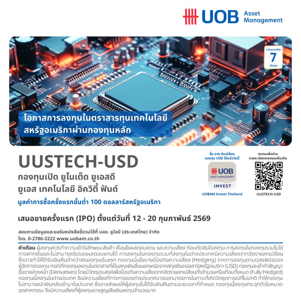 HoonSmart.com>> บลจ.ยูโอบี (ประเทศไทย) เปิดตัว “กองทุนเปิด ยูไนเต็ด ยูเอสดี ยูเอส เทคโนโลยี อิควิตี้ ฟันด์ (UUSTECH-USD)” เพิ่มโอกาสลงทุนในหุ้นที่เกี่ยวข้องกับธุรกิจเทคโนโลยีในสหรัฐฯ พร้อมรับผลตอบแทนในสกุลเงินดอลลาร์สหรัฐ เสนอขายครั้งแรก ระหว่าง 12 – 20 ก.พ.69