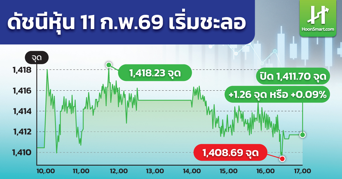 ทางด้านตลาดหุ้น วันที่ 11 ก.พ. 2569  ดัชนีเริ่มชะลอการปรับตัวขึ้นหลังจากวิ่งแรงมาสองวันติดต่อกัน โดยดัชนีปิดที่  1,411.70 จุด เพิ่มขึ้น 1.26 จุด หรือ +0.99% ด้วยมูลค่าการซื้อขายรวม 59,975.65 ล้านบาท  สำหรับนักลงทุนต่างชาติยังคงซื้อต่อเนื่อง 1,085.48 ล้านบาท ส่วนนักลงทุนไทยที่ขายทำกำไรติดต่อกันหลายวันเริ่มกลับมาซื้อ 977.42 ล้านบาท ทางด้านสถาบันไทยพลิกมาขายจำนวน 2,922.94 ล้านบาท  ค่าเงินบาทแข็งปิดที่ 31.05/09 ต่อดอลลาร์
