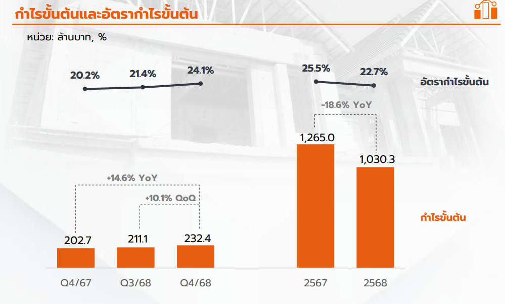 ด้านอัตรากำไรขั้นต้น อยู่ที่ 22.7% ปรับตัวลดลงจาก 25.5% จากปี 2567 โดยมีสาเหตุหลักมาจากการลดลงของยอดขาย โดยเฉพาะผลิตภัณฑ์อิฐมวลเบา กระเบื้องหลังคาคอนกรีต และกระเบื้องหลังคาไฟเบอร์ซีเมนต์ ส่งผลให้อัตราการใช้กำลังการผลิตลดลง ทำให้ต้นทุนคงที่ต่อหน่วยปรับตัวสูงขึ้น ประกอบกับต้นทุนวัตถุดิบหลัก โดยเฉพาะปูนซีเมนต์ปรับตัวสูงขึ้น รวมถึงการปรับลดราคาขายอย่างมีนัยสำคัญ เพื่อกระตุ้นการตัดสินใจซื้อของผู้บริโภคภายใต้ภาวะกำลังซื้อที่ยังอ่อนแรง