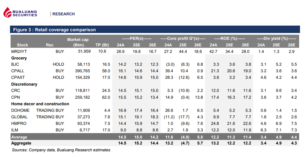 บล.บัวหลวง แนะนำ “ซื้อ” หุ้น CRC โดยให้ราคาเป้าหมายที่ 24.50 บาท มองว่ามูลค่าหุ้นยังถูกมากเมื่อเทียบกับค่าเฉลี่ยย้อนหลัง และมีเงินปันผลช่วยจำกัดความเสี่ยงด้านขาลง ปัจจุบัน CRC ซื้อขายที่ PER ปี 2569 เพียง 15 เท่า ต่ำกว่าค่าเฉลี่ย 3 ปีที่ 23.6 เท่า ถึง 36% โดยคาดเงินปันผลครึ่งหลังปี 2568 ที่ 1.20 บาทต่อหุ้น คิดเป็น Dividend Yield ราว 6.1%