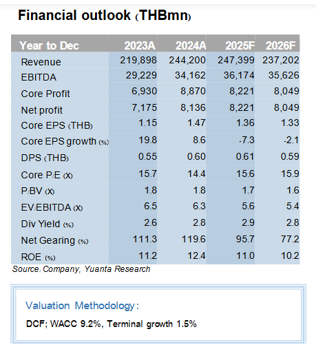 ด้านต้นทุน CRC จะได้แรงหนุนจากการขาย NKT ซึ่งเคยขาดทุนปีละ 200–300 ล้านบาท และภาระดอกเบี้ยที่ลดลงหลังการขายธุรกิจในอิตาลีไปชำระหนี้ ทำให้คาดว่ากำไรหลักจะกลับมาเติบโต YoY ตั้งแต่ไตรมาส 2/69 และคงประมาณการกำไรหลักปี 2569 ที่ 7.84 พันล้านบาท เพิ่มขึ้น 2% YoY