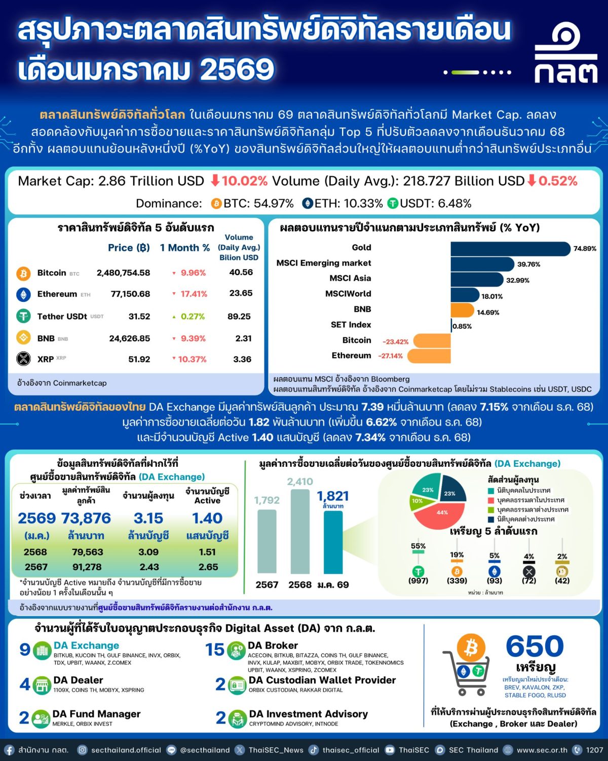 สำนักงานคณะกรรมการกำกับหลักทรัพย์และตลาดหลักทรัพ (ก.ล.ต.) สรุป ตลาดสินทรัพย์ดิจิทัลโลก เดือนมกราคม 2569 มูลค่ารวมลดลงเหลือ 2.86 ล้านล้านดอลลาร์สหรัฐ ลดลง 10.02%) โดยบิตคอยน์และอีเธอเรียมปรับตัวลงกว่า 10–12% ขณะที่สินทรัพย์ดิจิทัลในไทยยังมีมูลค่า 73,876 ล้านบาท มูลค่าซื้อขายเฉลี่ยรายวัน 3.15 พันล้านบาท เพิ่มขึ้น 6.62% จากเดือนก่อน แม้จำนวนบัญชีผู้ใช้งานลดลง 7.34% สะท้อนแรงซื้อขายที่ยังคงมีอยู่ในตลาดภายในประเทศ