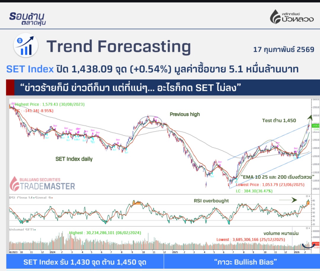สำหรับประเด็นคำร้องศาลฯ รธน. และปกครองฯ เรื่องบาร์โค้ดและ QR Code ที่ตลาด ยังไม่ได้ให้น้ำหนักเมื่อวานนี้ เรายังแนะให้ตามข่าวต่อ โดยมองเป็น หากมีเหตุเกิด มองการปรับฐานจะไม่เกินระยะ 2 สัปดาห์นี้ <span;>คาดว่าตลาดหุ้นไทยมีแนวโน้มแกว่งตัวในช่วง 1,390–1,460 จุด ระหว่างวันที่ 17 ก.พ.–2 มี.ค.