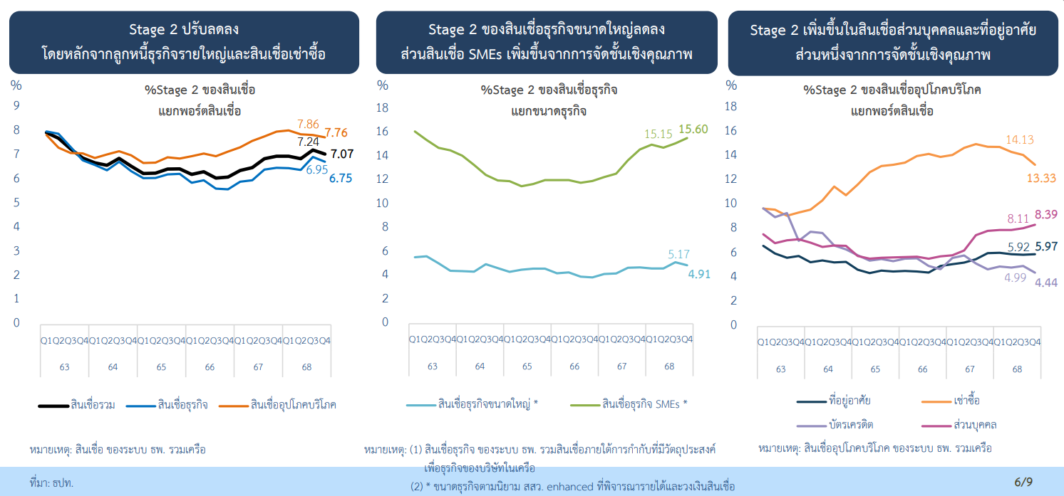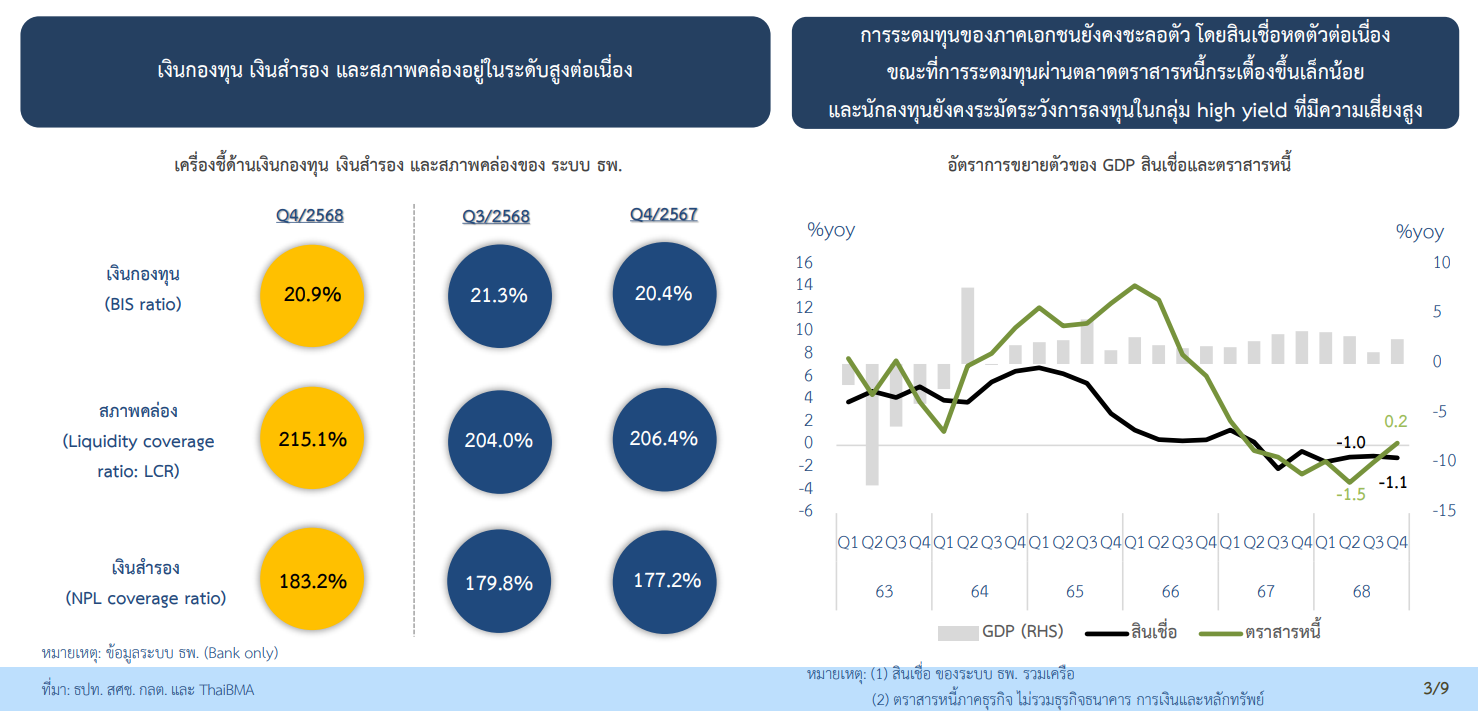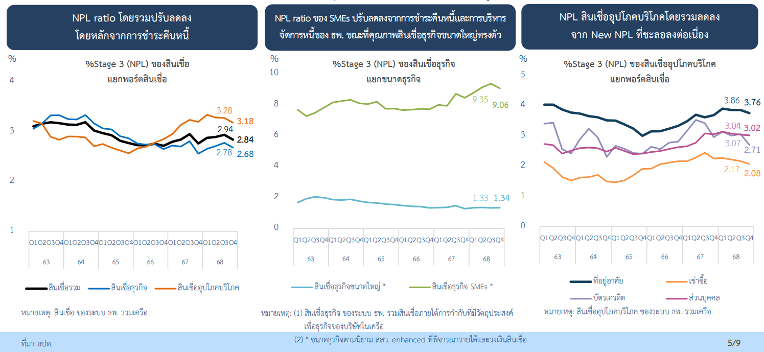 ส่วนหนึ่งจากความต้องการสินเชื่อที่ลดลงตามภาวะเศรษฐกิจ ด้านคุณภาพสินเชื่อ NPL (Stage 3) ไตรมาส 4 ปี 2568 ปรับลดลงมาอยู่ที่ 536.0 พันล้านบาท จากการชำระคืนหนี้ และการบริหารจัดการคุณภาพสินเชื่อ ส่งผลให้สัดส่วน NPL ต่อสินเชื่อรวม ปรับลดลงมาอยู่ที่ 2.84% สำหรับสินเชื่อ Stage 2 ปรับลดลง มาอยู่ที่ 7.07% จากการชำระคืนหนี้ได้ตามเงื่อนไขการปรับโครงสร้างหนี้เป็นสำคัญ นอกจากนี้ ธนาคารพาณิชย์ยังให้ความช่วยเหลือลูกหนี้อย่างต่อเนื่อง
