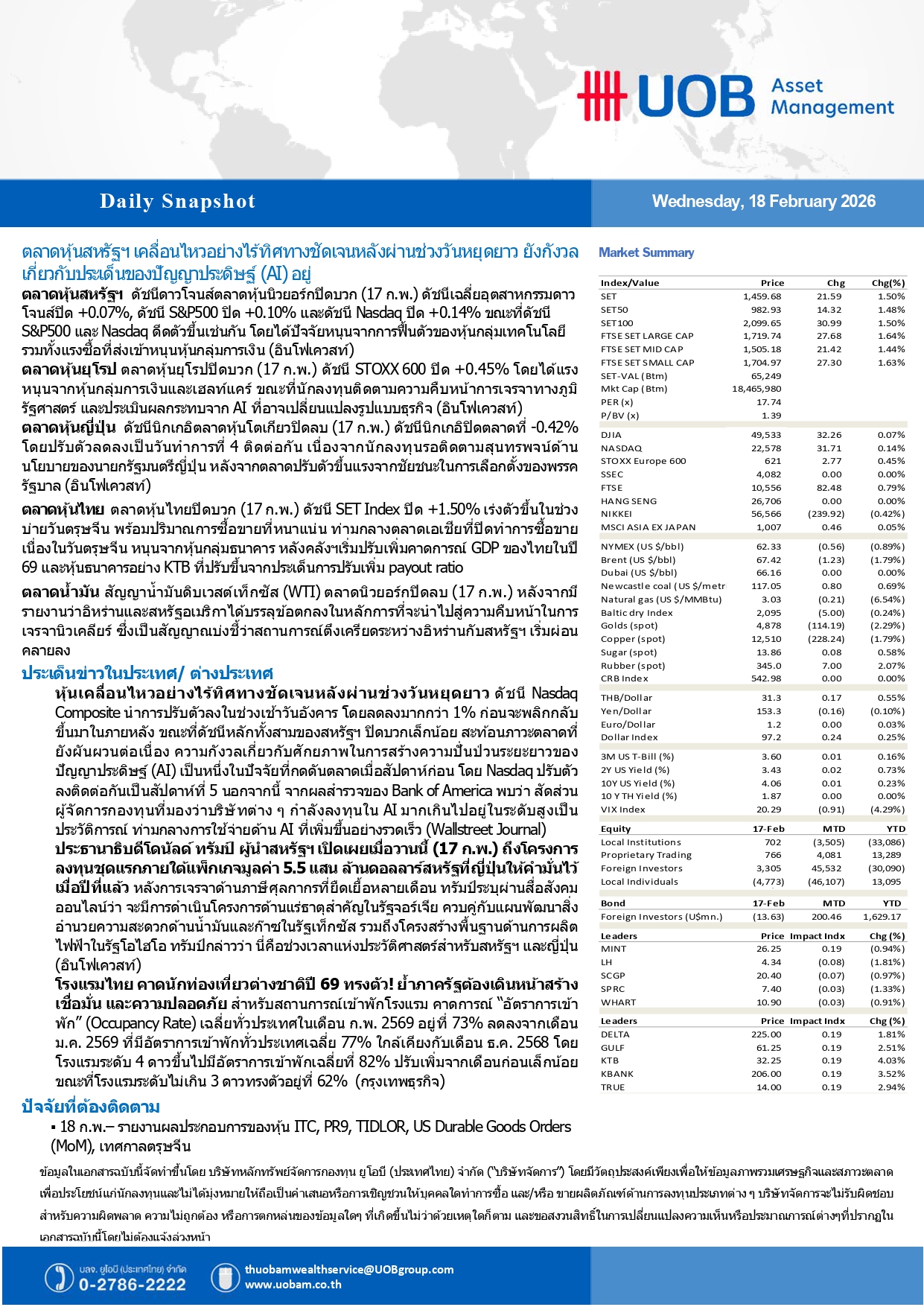 UOBAM : ตลาดหุ้นสหรัฐฯ ไร้ทิศทางชัดเจนหลังผ่านช่วงวันหยุดยาว ยังกังวลประเด็นปัญญาประดิษฐ์ (AI) 18/02/2026 09:08009Breaking NewsUOBAM ———————————————————————————————————————————————————– Facebook iconFacebookTwitter iconTwitterLINE iconLine