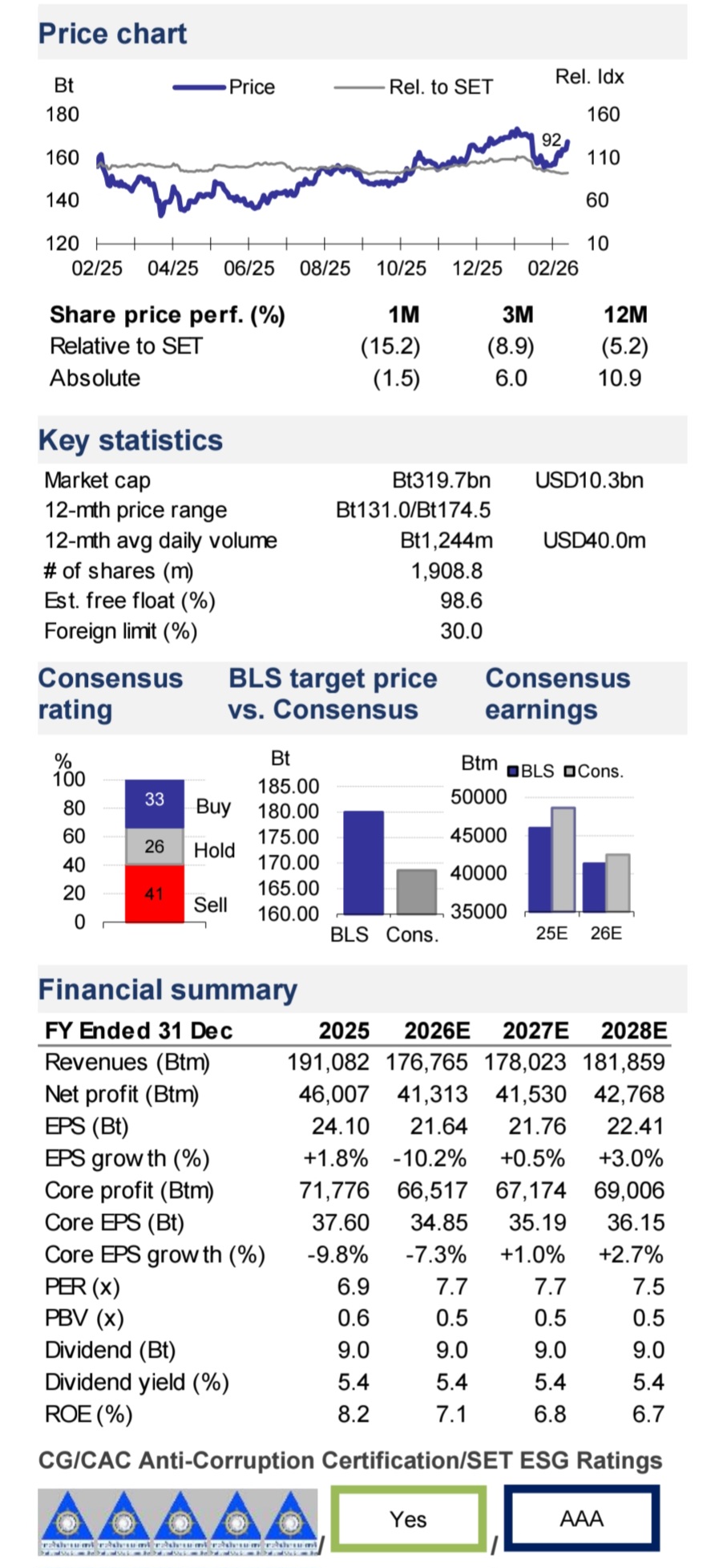 BBL มีฐานเงินกองทุนที่แข็งแกร่ง โดยมีอัตราส่วนเงินกองทุนชั้นที่ 1 ที่เป็นส่วนของเจ้าของ (CET1) อยู่ที่ 17.2% ณ สิ้นปี 2568 (ใกล้เคียงค่าเฉลี่ยกลุ่มธนาคารที่เราให้คำแนะนำที่ 17.1% และสูงกว่าข้อกำหนดขั้นต่ำที่ 8.0% อย่างมาก)