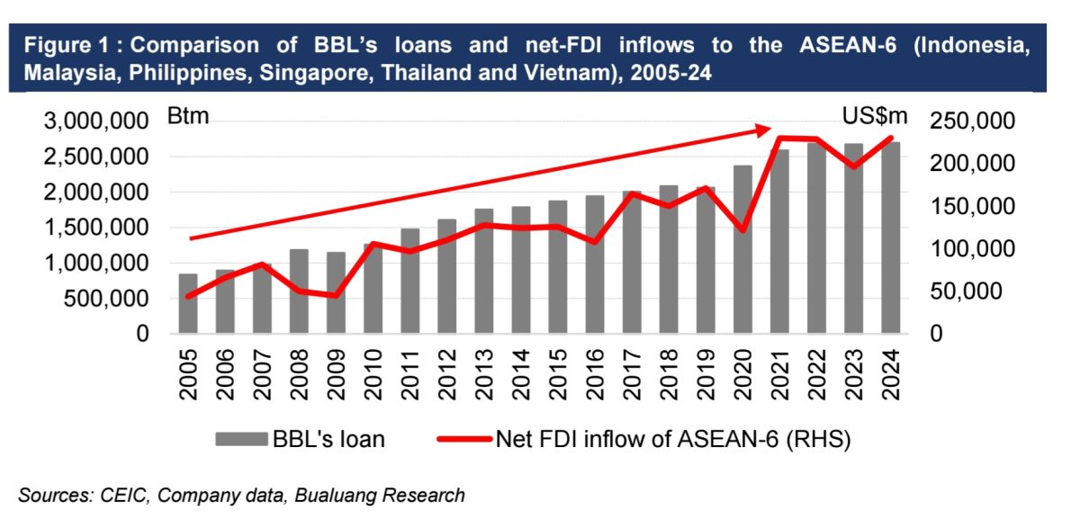 จากการศึกษาข้อมูลในช่วงปี 2548–2567 พบว่า แนวโน้มการเติบโตของสินเชื่อ BBL และทิศทางเงินลงทุนสุทธิ FDI ที่ไหลเข้าสู่กลุ่ม ASEAN-6 (อินโดนีเซีย มาเลเซีย ฟิลิปปินส์ สิงคโปร์ ไทย และเวียดนาม) มีความสัมพันธ์กันสูงถึง 92% โดยสินเชื่อของ BBL มักเร่งตัวในช่วงที่เงินลงทุนสุทธิไหลเข้าสู่อาเซียนมากขึ้น