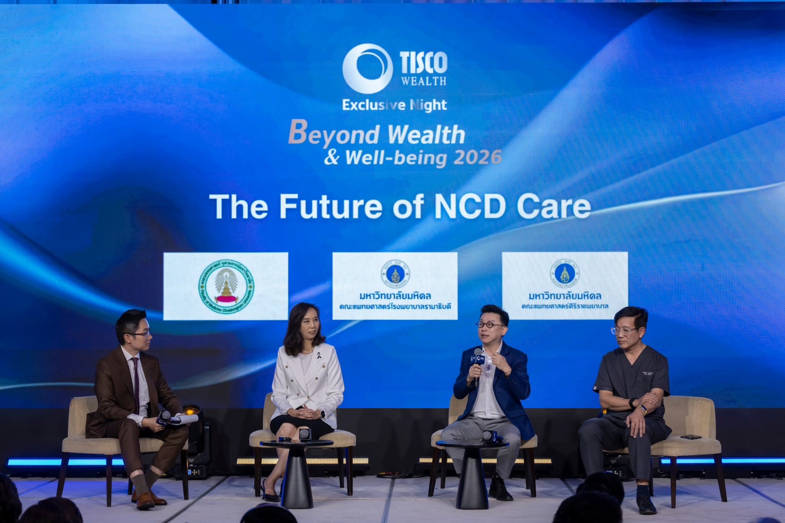งานเสวนาช่วง ‘The Future of NCD Care’ ธนาคารทิสโก้ร่วมกับพันธมิตรโรงพยาบาลรัฐที่เป็นโรงเรียนแพทย์ ให้ความรู้เกี่ยวกับโรคไม่ติดต่อเรื้อรัง (NCDs) ซึ่งเป็นสาเหตุการเสียชีวิตอันดับ 1 ของคนไทย โดยได้รับเกียรติจาก ศ.พญ.นิจศรี ชาญณรงค์ หัวหน้าศูนย์ประสาทศาสตร์ และแพทย์ผู้เชี่ยวชาญด้านระบบประสาท และโรคหลอดเลือดสมอง คณะแพทยศาสตร์ จุฬาลงกรณ์มหาวิทยาลัย และ ศ.นพ.สุรเดช หงส์อิง รองคณบดีฝ่ายกิจการพิเศษ หัวหน้าศูนย์ความเป็นเลิศเซลล์บำบัดและยีนบำบัด คณะแพทยศาสตร์โรงพยาบาลรามาธิบดี มหาวิทยาลัยมหิดล ร่วมด้วย รศ.นพ.ปรัญญา สากิยลักษณ์ แพทย์ผู้เชี่ยวชาญด้านศัลยกรรมทรวงอก คณะแพทยศาสตร์ศิริราชพยาบาล มหาวิทยาลัยมหิดล ร่วมแลกเปลี่ยนมุมมองด้านการป้องกันและนวัตกรรมการรักษา