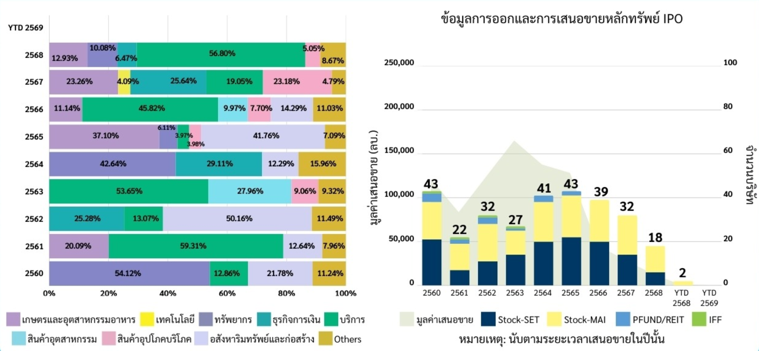 สำนักงานคณะกรรมการกำกับหลักทรัพย์และตลาดหลักทรัพย์ (ก.ล.ต.) เปิดเผยว่า ตั้งแต่วันที่ 1 ม.ค.2569 มีคำขอที่ได้รับอนุญาตและพร้อมเสนอขาย IPO จำนวน 5 หลักทรัพย์ ได้แก่ หุ้นบริษัท ไทยน้ำทิพย์ คอร์ปอเรชั่น (TNCC) และหุ้นบริษัท เพ็ทพัล โปรดักส์ (PETAL) ในกลุ่มเกษตรและอุตสาหกรรมอาหาร หุ้นบริษัท ยูนิคพลาสติก อินดัสตรี (UNIX) ในกลุ่มสินค้าอุตสาหกรรม, หุ้นบริษัท ไทยอีสเทิร์น ไบโอ พาวเวอร์ (TEBP) กลุ่มทรัพยากรและทรัสต์เพื่อการลงทุนในสิทธิการเช่าอสังหาริมทรัพย์ออนิกซ์ (ONYXRT) กลุ่มอสังหาริมทรัพย์และก่อสร้าง โดยอยู่ระหว่างการพิจารณาคำขอ 2 หลักทรัพย์ ได้แก่ หุ้นบริษัท กลุ่มภัทร (PHAT) กลุ่มเกษตรและอุตสาหกรรมอาหาร และบริษัท ควิก ทรานส์ฟอร์เมชั่น (QUICK) กลุ่มเทคโนโลยีและอยู่ระหว่าง Pre-consult จำนวน 38 หลักทรัพย์