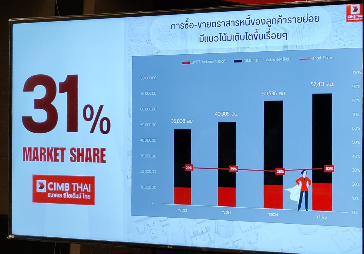 HoonSmart.com>>ธนาคาร ซีไอเอ็มบี ไทย ตั้งเป้า WUM โต 3 เท่า ใกล้แตะ 1 ล้านล้านบาทใน 5 ปี เปิดตัวบริการใหม่รายแรกในไทย ด้วยฟีเจอร์ CIMB My Bond รวมข้อมูลพันธบัตร หุ้นกู้ แปลงใบหุ้นกระดาษให้อยู่ในรูปดิจิทัลรายแรกในไทย ซื้อง่าย ขายครบ จบในแอปเดียว สร้างวัฒนธรรมการลงทุนแบบใหม่ให้รายย่อย เพิ่มสภาพคล่องในตลาดรอง มั่นใจไปได้อีกไกลจากปัจจุบันเทรดกันปีละแค่ 5 หมื่นล้านบาท