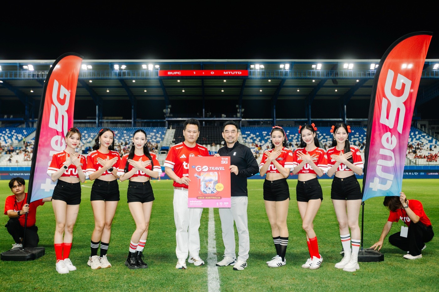 เกมใหญ่ที่แฟนบอลรอคอยกลับมาทำสนามลุกเป็นไฟอีกครั้ง เมื่อ ทรู แบงค็อก ยูไนเต็ด เปิดบ้านทรู บีจี สเตเดียม รับการมาเยือนของ เมืองทอง ยูไนเต็ด ในศึกไทยลีก 2025/26 ท่ามกลางบรรยากาศเชียร์สุดเดือดแบบ “แน่นทุกโซน” โดย ทรู คอร์ปอเรชั่น เดินหน้าสนับสนุนฟุตบอลไทยอย่างต่อเนื่อง ร่วมส่งแรงใจข้างสนาม นำโดย นายขจร เจียรวนนท์ ประธานสโมสรทรู แบงค็อก ยูไนเต็ด พร้อมด้วย บมจ.ทรู คอร์ปอเรชั่น โดย นายโอลิเวอร์ กิตติพงษ์ วีระเตชะ หัวหน้าคณะผู้บริหารด้านแบรนด์และมีเดีย ร่วมส่งพลังไปกับแฟนบอลที่พร้อมใจกันเชียร์สุดเสียงตั้งแต่นกหวีดแรก ทำให้บรรยากาศในสนามคึกคัก และสมศักดิ์ศรี “บิ๊กแมตช์ของจริง” พร้อมกันนี้ ทรูยังอัพสัญญาณ ทรู5G ให้ครอบคลุมทุกโซนของทรู บีจี สเตเดียม รองรับการใช้งานของแฟนบอลอย่างเต็มประสิทธิภาพ ทั้งการไลฟ์ แชร์โมเมนต์ และอัปโหลดความมันแบบเรียลไทม์ ด้วยสัญญาณแรงเร็ว เสถียรตลอดการแข่งขัน