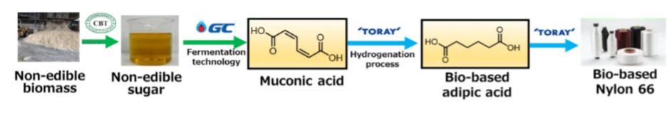 ด้วยความเชี่ยวชาญด้านเทคโนโลยีการหมักขั้นสูง GC สามารถแปลงน้ำตาลจากกากอ้อยและกากมันสำปะหลังให้เป็นกรดมิวโคนิกชีวภาพมูลค่าสูง ผสานเทคโนโลยีของ Toray Industries, Inc. ในการผลิตกรดอะดิปิกชีวภาพบริสุทธิ์สูง สำหรับการผลิตไนลอน-6,6 ที่เป็นมิตรต่อสิ่งแวดล้อม นวัตกรรมนี้สามารถต่อยอดสู่ผลิตภัณฑ์สิ่งทอ ชิ้นส่วนยานยนต์ และอุปกรณ์อิเล็กทรอนิกส์ โดยตั้งเป้าการผลิตเชิงพาณิชย์หลายพันตันต่อปี ภายในปี 2573
