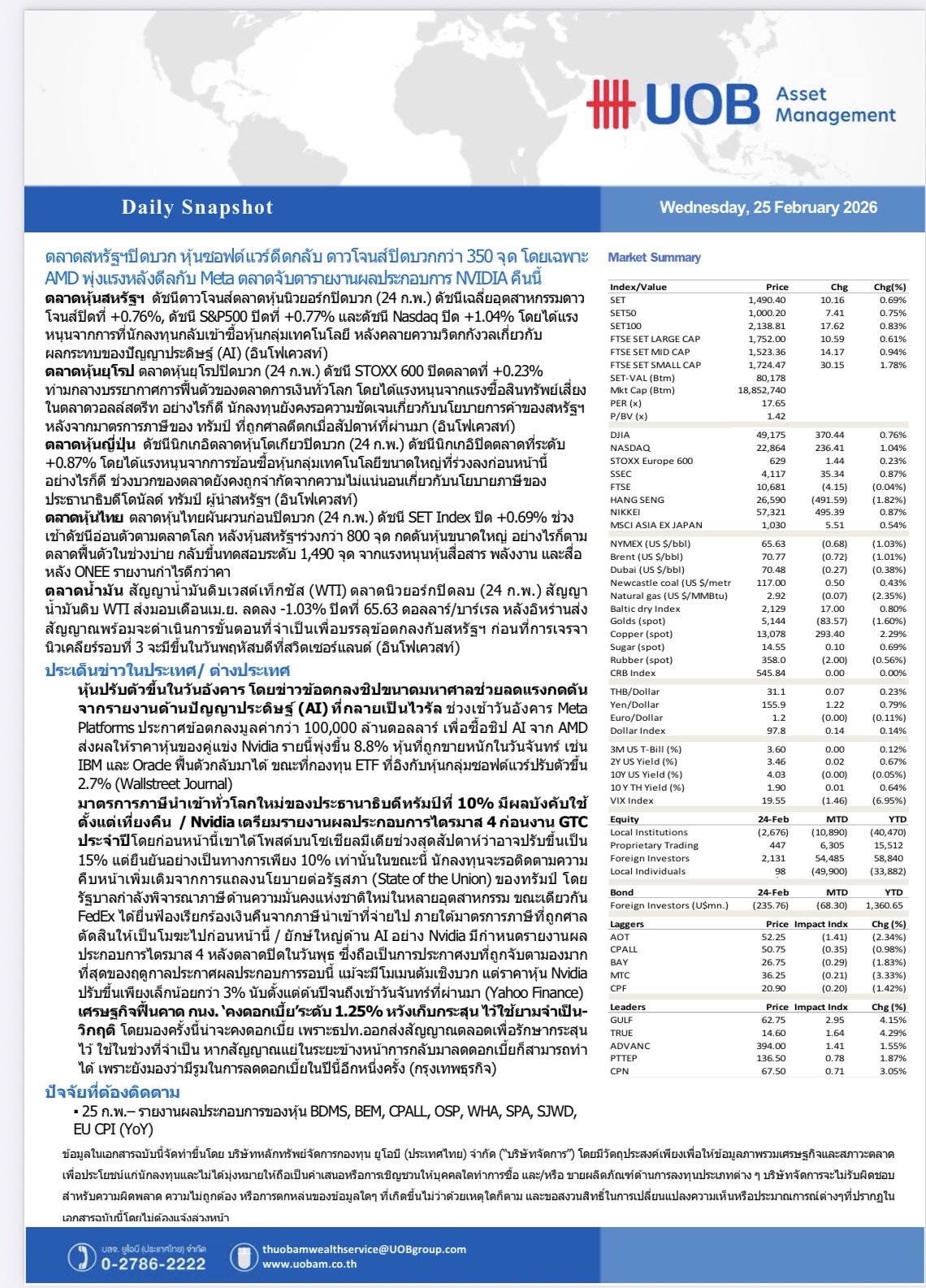 HoonSmart.com>> UOBAM Daily Snapshot : ตลาดสหรัฐฯปิดบวก หุ้นซอฟต์แวร์ดีดกลับ ดาวโจนส์ปิดบวกกว่า 350 จุด โดยเฉพาะ AMD พุ่งแรงหลังดีลกับ Meta ตลาดจับตารายงานผลประกอบการ NVIDIA คืนนี้