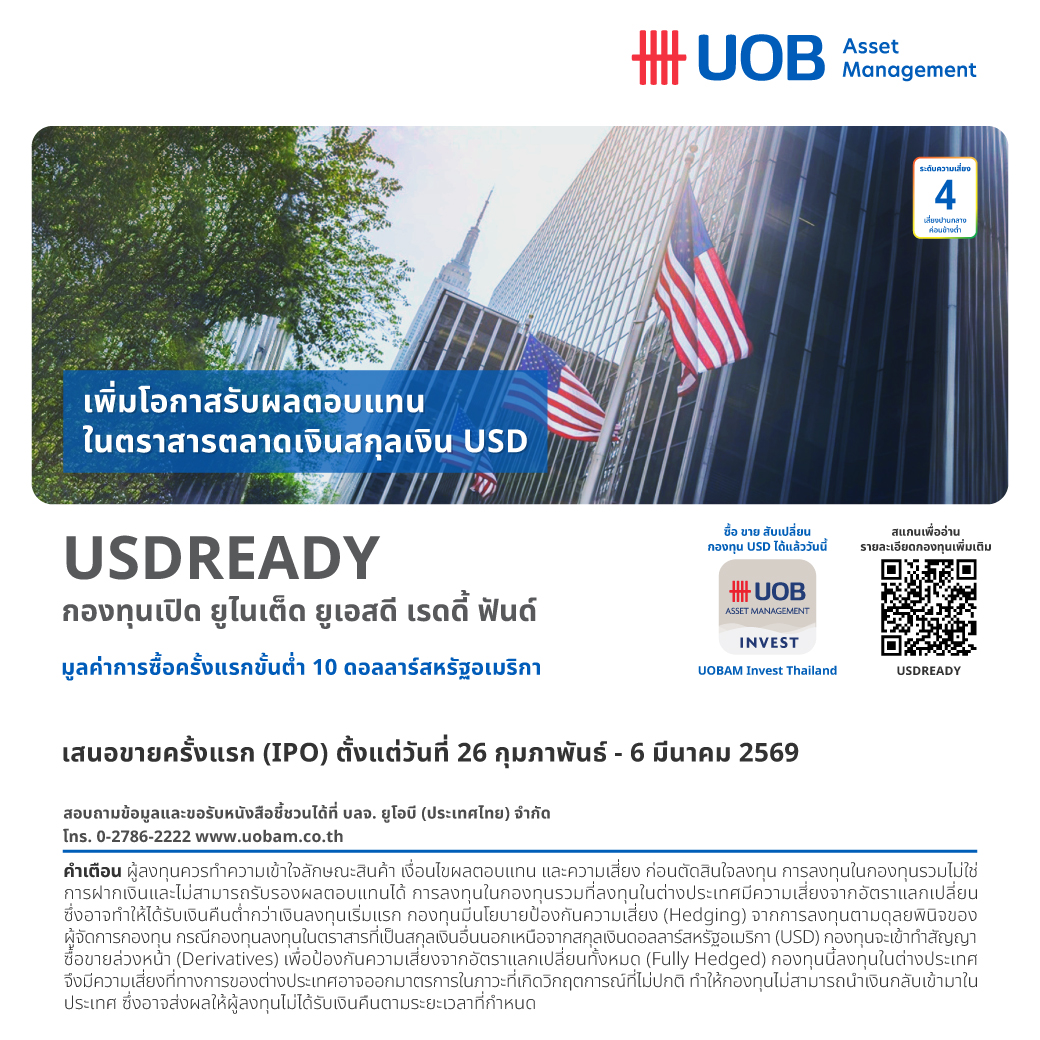 บริษัทหลักทรัพย์จัดการกองทุน (บลจ.) ยูโอบี (ประเทศไทย) จำกัด หรือ UOBAM เสนอโอกาสการลงทุนในกองทุนเปิด ยูไนเต็ด ยูเอสดี เรดดี้ ฟันด์ (USDREADY) กองทุนรวมตราสารหนี้ที่ลงทุนในตราสารระยะสั้นโดยเฉพาะตราสารตลาดเงินคุณภาพสูง ที่มีสกุลเงินเป็นดอลลาร์สหรัฐ (USD) เพื่อนำเสนอทางเลือกให้แก่นักลงทุนที่ต้องการกระจายความเสี่ยงของพอร์ตการลงทุน พร้อมเพิ่มโอกาสรับผลตอบแทนในสกุลเงินดอลลาร์สหรัฐ เสนอขายครั้งแรกระหว่างวันที่ 26 กุมภาพันธ์ – 6 มีนาคม 2569