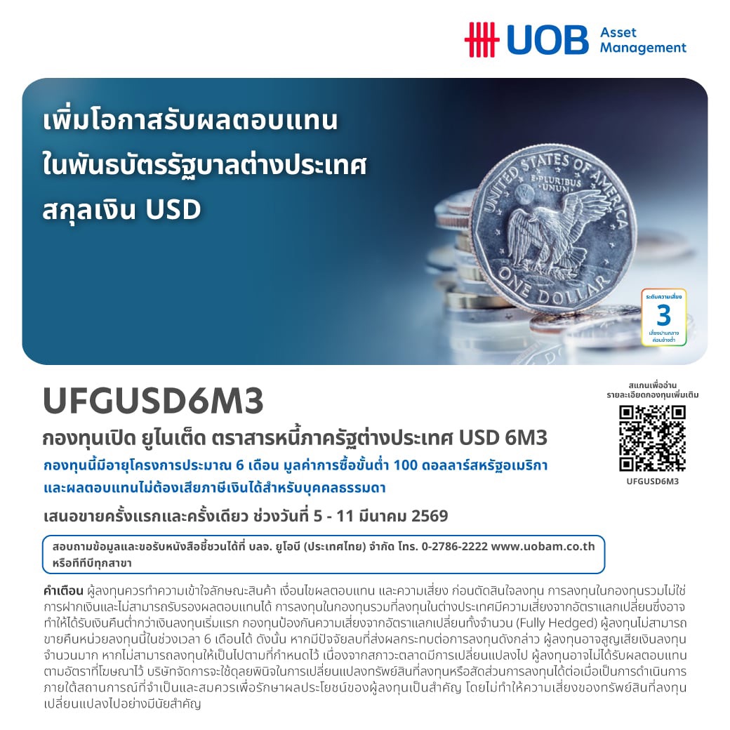 บริษัทหลักทรัพย์จัดการกองทุน (บลจ.) ยูโอบี (ประเทศไทย) จำกัด หรือ UOBAM ได้เสนอขายหน่วยลงทุนครั้งแรก (IPO) กองทุนเปิด ยูไนเต็ด ตราสารหนี้ภาครัฐต่างประเทศ USD 6M3 (UFGUSD6M3) อายุประมาณ 6 เดือน มีประมาณการผลตอบแทน 3.30% ต่อปี (ข้อมูลจากอัตราผลตอบแทนที่เสนอโดยผู้ออกตราสาร หรือจากผู้ขาย ณ วันที่ 27 กุมภาพันธ์ 2569) กองทุนมีขนาดโครงการ 200 ล้านดอลลาร์สหรัฐ โดยเสนอขายในราคา 10 ดอลลาร์สหรัฐต่อหน่วย และยอดลงทุนครั้งแรกขั้นต่ำ 100 ดอลลาร์สหรัฐ