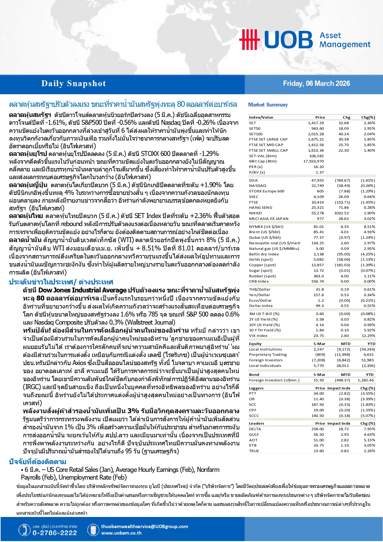 UOBAM Daily Snapshot : ตลาดหุ้นสหรัฐฯปรับตัวลงแรง-ราคาน้ำมันสหรัฐพุ่งทะลุ 80 ดอลลาร์/บาร์เรล 06/03/2026 10:4806/03/2026 10:54009Breaking News, Fund Manager ———————————————————————————————————————————————————– Facebook iconFacebookTwitter iconTwitterLINE iconLine