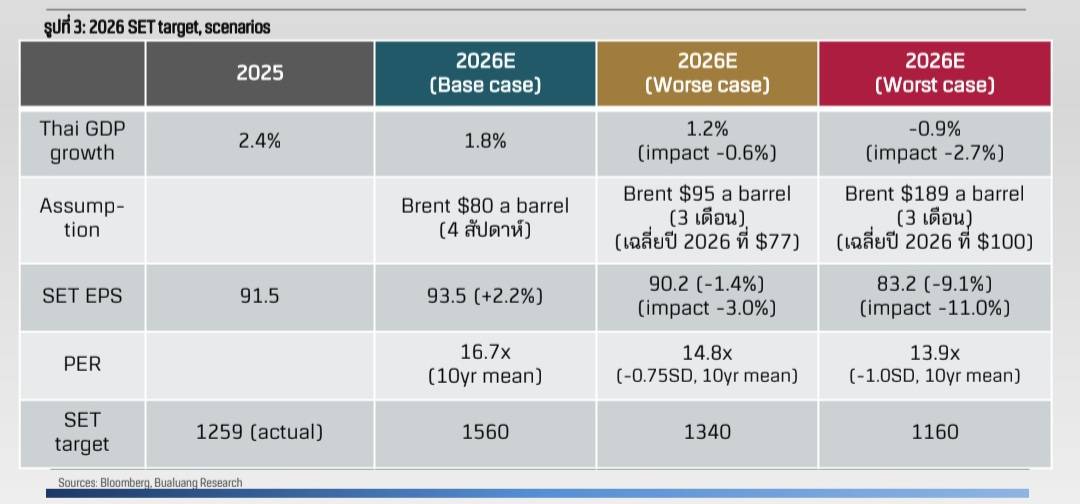 ดร.วัชราภรณ์ กันทะพะเยา ผู้จัดการฝ่ายวิเคราะห์การลงทุนเพื่อบริหารความมั่งคั่ง สายงานวิจัย (นักเศรษฐศาสตร์ ) และนายพิริยพล คงวาณิชนักกลยุทธ์/ผู้จัดการกองทุน/นักวิเคราะห์การลงทุนปัจจัยพื้นฐานด้านหลักทรัพย์ ฝ่าย Wealth Research บล.บัวหลวง วิเคราะห์ “ผลกระทบสงคราม” เศรษฐกิจ-ตลาดหุ้นไทย ประเมินดัชนีตลาดหลักทรัพย์แห่งประเทศไทย (SET) ปี 2569 ที่ 1,560 จุด โดยวิเคราะห์ผ่าน 3 ฉากทัศน์ฉากทัศน์สงครามน้ำมันกับทิศทางตลาดหุ้นไทย