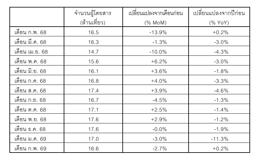 HoonSmart.com>>กองทุนโครงสร้างพื้นฐาน BTSGIF เปิดจำนวนผู้โดยสารเดือนก.พ.69 อยู่ที่ 16.6 ล้านเที่ยว เพิ่มขึ้น 0.2% จาก YoY แต่ลดลง 2.7% จากเดือนก่อน (MoM)