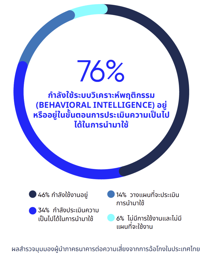 • ให้คุณค่ากับการวิเคราะห์ด้านพฤติกรรม: ผู้นำในภาคธนาคารไทยมองว่าโซลูชันที่อาศัยการวิเคราะห์พฤติกรรมมีคุณค่าสูง โดย 76% ระบุว่าธนาคารของตนใช้งานโซลูชันแบบดังกล่าวอยู่แล้ว หรืออยู่ระหว่างประเมินเพื่อพิจารณานำมาใช้