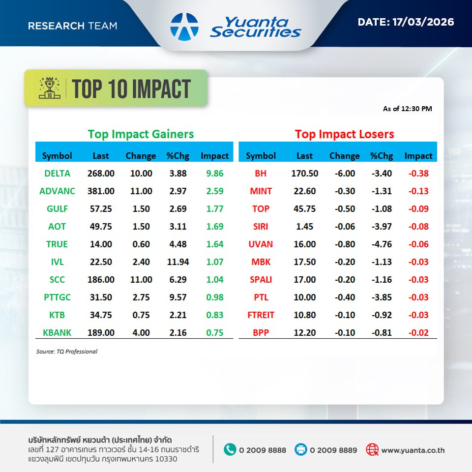 สำหรับมุมมองภาคบ่าย คาด SET Index แกว่งตัว Sideways ในกรอบ 1,430 – 1,445 จุด เมื่อเทียบกับราคาปิด ณ ช่วงเช้า โดยมอง Sentiment เชิงบวกยังคงมาจากความหวังมาตรการ/โครงการทางเศรษฐกิจจากรัฐบาลชุดใหม่ ท่ามกลางการประชุมสภาฯและการลงมติเลือกนายกฯที่จะเกิดขึ้นในวันที่ 19 มี.ค.69