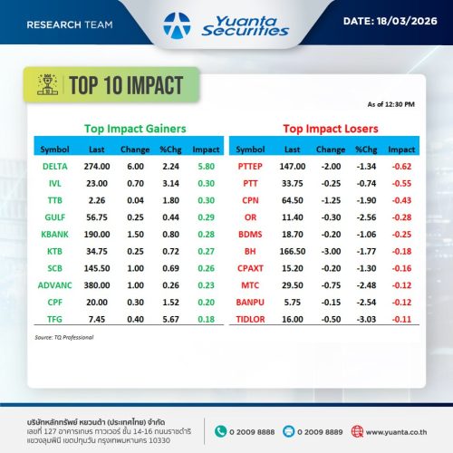 สำหรับแนวโน้มภาคบ่ายคาด SET Index แกว่งตัวออกข้าง ในกรอบ 1,430 – 1,450 จุด หุ้นเด่น BTG รับประโยชน์จากการปรับขึ้นของราคาสุกรอ้างอิง 4 บาท จากสัปดาห์ก่อน สู่ระดับ 68-70 บาทต่อกิโลกรัม เนื่องจากผลการปรับขึ้นของราคาต้นทุนอาหาร และ ราคาค่าขนส่ง ซึ่งรับผลกระทบจากสงครามในตะวันออกกลาง มองเป็นบวกกับรายได้ของบริษัท