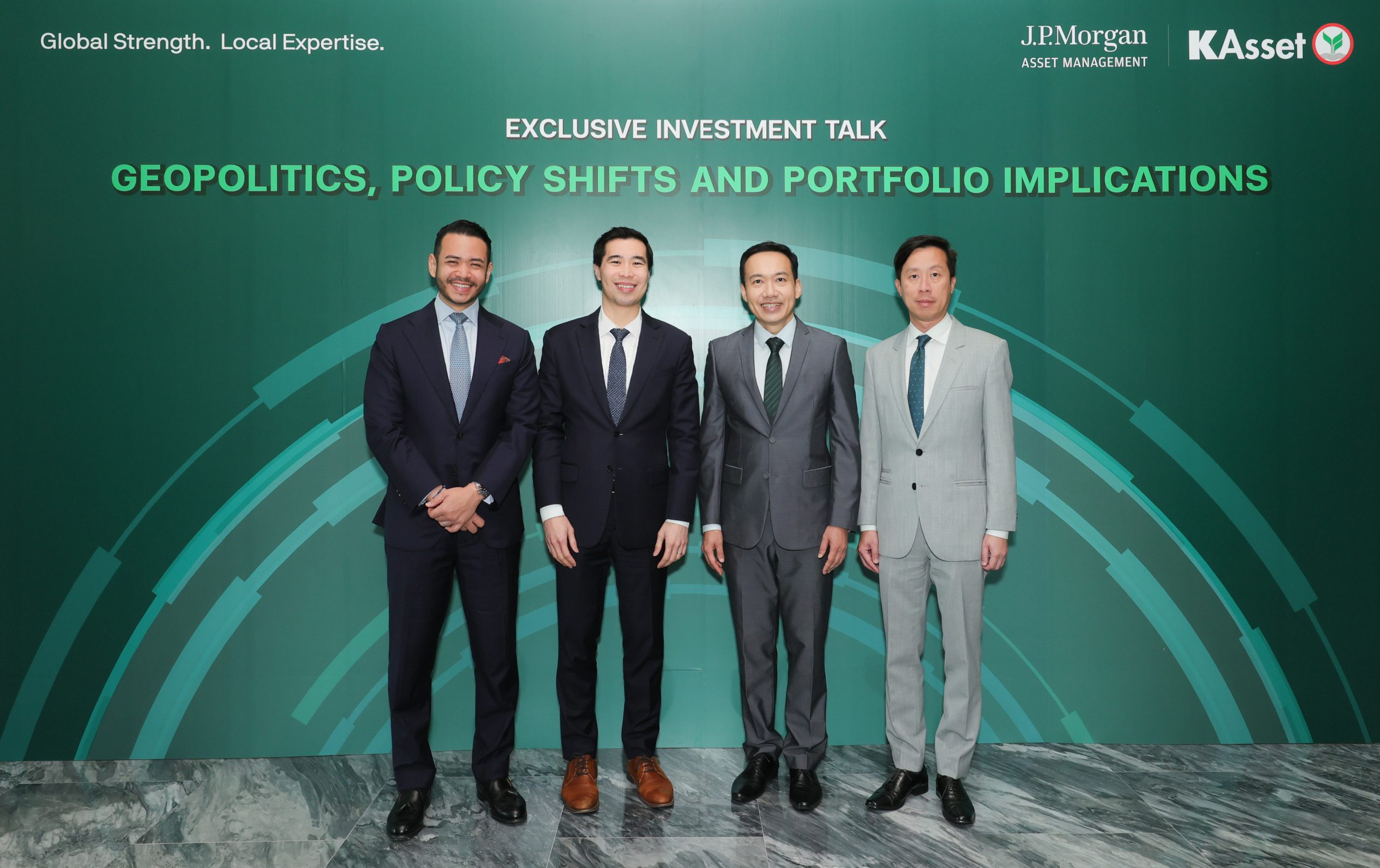 บริษัทหลักทรัพย์จัดการกองทุน (บลจ.) กสิกรไทย จำกัด ร่วมกับ J.P. Morgan Asset Management (JPMAM) จัดงานสัมมนา Exclusive Investment Talk: Geopolitics, Policy Shifts and Portfolio Implications โดยเนื้อหาการเสวนามุ่งสะท้อนภาพใหญ่ของโลกในมุมมองของผู้เชี่ยวชาญด้านนโยบายการเงิน ซึ่งครอบคลุมประเด็นสำคัญ อาทิ ผลกระทบจากความขัดแย้งในตะวันออกกลาง ความไม่แน่นอนทางด้านภูมิรัฐศาสตร์ และทิศทางนโยบายการเงิน พร้อมเชื่อมโยงสู่กรอบการจัดพอร์ตอย่างเป็นระบบ โดยได้รับเกียรติจาก วิน พรหมแพทย์, CFA (ที่ 2 จากขวา) ประธานกรรมการบริหาร บลจ.กสิกรไทย และ Mr.Geng Ngarmboonanant (ที่ 2 จากซ้าย) Deputy Head of Research and Head of Macro and Policy, Multi-Asset Solutions, JPMAM ณ โรงแรม แอนดาซ วัน แบงค็อก กรุงเทพฯ เมื่อเร็วๆ นี้