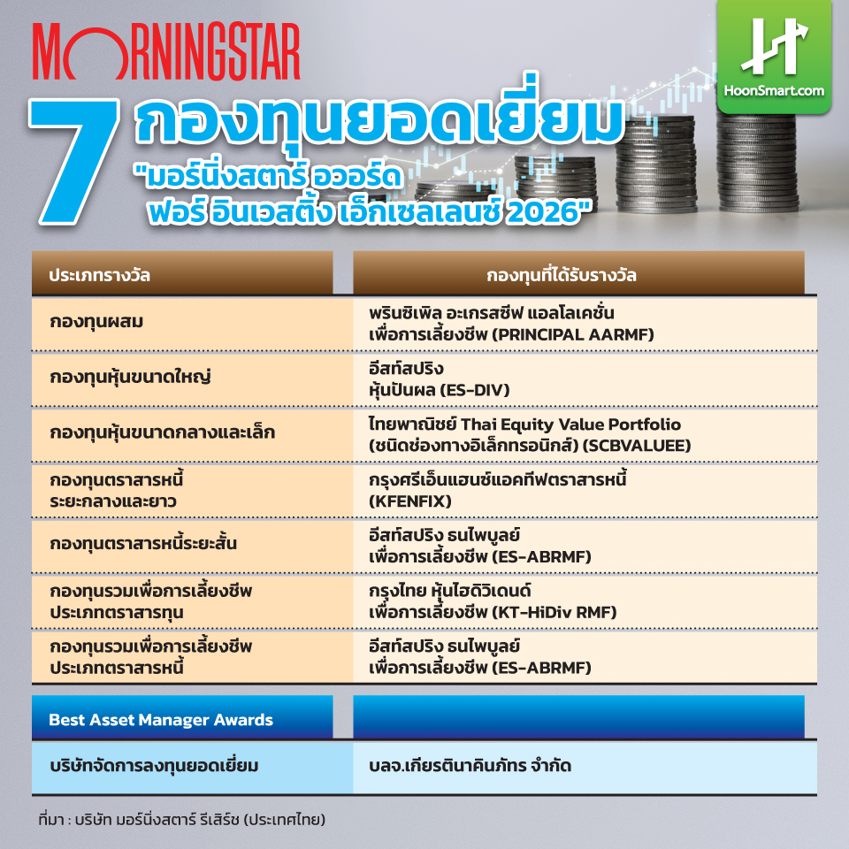 HoonSmart.com>> Morningstar ประกาศรางวัล “มอร์นิ่งสตาร์ อวอร์ด ฟอร์ อินเวสติ้ง เอ็กเซลเลนซ์ ไทยแลนด์ 2026” กองทุนยอดเยี่ยม “บลจ.อีสท์สปริง” กวาดสูงสุด 3 รางวัล ด้าน “KT-HiDiv RMF” คว้ากองทุน RMF ตราสารทุนยอดเยี่ยม 3 ปีซ้อน ส่วน “KFENFIX – PRINCIPAL AARMF – SCBVALUEE” ขึ้นแท่นปีนี้ ด้าน “บลจ.เกียรตินาคินภัทร” ครองบริษัทจัดการลงทุนยอดเยี่ยม 2 ปีติด