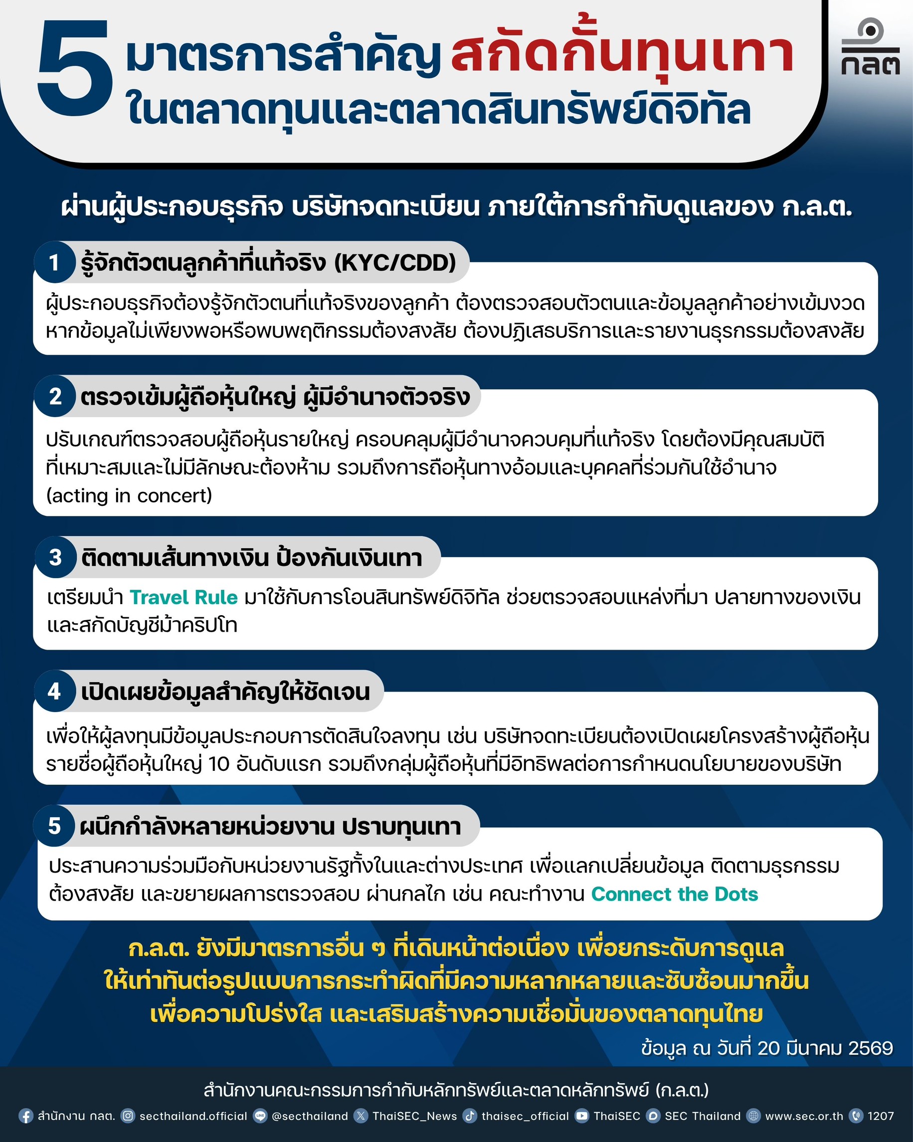 ก.ล.ต.เดินหน้า 5 มาตรการ “สกัดกั้นทุนเทา” ฟอกเงินผ่านตลาดทุน–สินทรัพย์ดิจิทัล 20/03/2026 16:01009Breaking Newsก.ล.ต., สกัดกั้นทุนเทา HoonSmart.com>>ก.ล.ต.เดินหน้ามาตรการสกัดกั้นทุนเทา ป้องกันและยับยั้งไม่ให้ “ตลาดทุน–สินทรัพย์ดิจิทัล” ถูกใช้เป็นช่องทางการฟอกเงินและอาชญากรรมทางเทคโนโลยี Facebook iconFacebookTwitter iconTwitterLINE iconLine