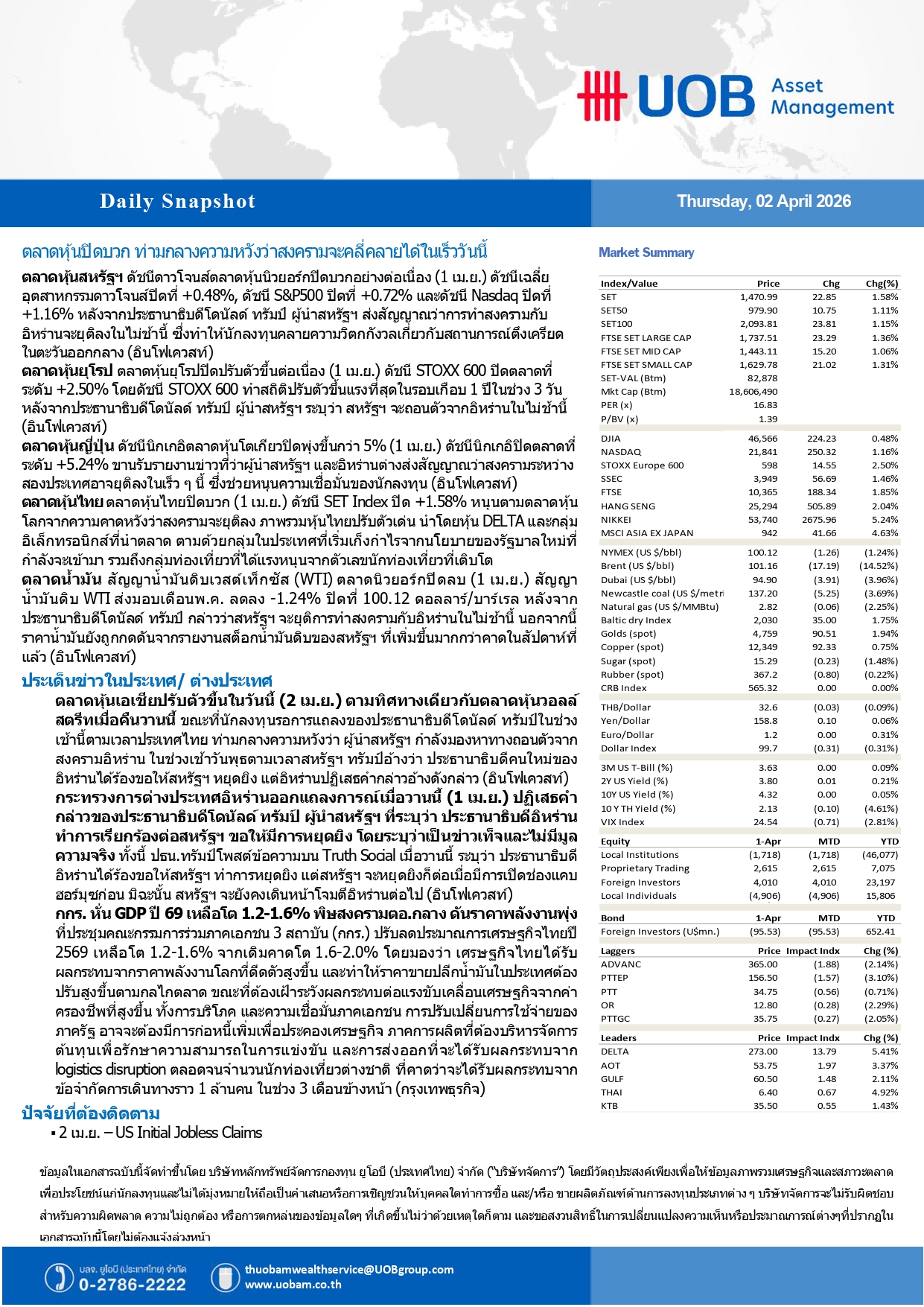 UOBAM Daily Snapshot : ตลาดหุ้นปิดบวก ท่ามกลางความหวังว่าสงครามจะคลี่คลายได้ในเร็ววันนี้