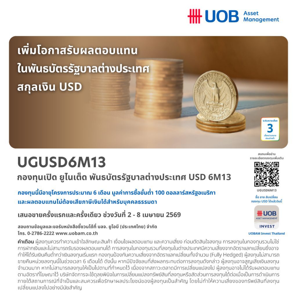 บริษัทหลักทรัพย์จัดการกองทุน (บลจ.) ยูโอบี (ประเทศไทย) จำกัด หรือ UOBAM ได้เสนอขายหน่วยลงทุนครั้งแรก (IPO) กองทุนเปิด ยูไนเต็ด พันธบัตรรัฐบาลต่างประเทศ USD 6M13 (UGUSD6M13) อายุประมาณ 6 เดือน มีประมาณการผลตอบแทน 3.35% ต่อปี (ข้อมูลจากอัตราผลตอบแทนที่เสนอโดยผู้ออกตราสาร หรือจากผู้ขาย ณ วันที่ 30 มีนาคม 2569) กองทุนมีขนาดโครงการ 200 ล้านดอลลาร์สหรัฐ โดยเสนอขายในราคา 10 ดอลลาร์สหรัฐต่อหน่วย และยอดลงทุนครั้งแรกขั้นต่ำ 100 ดอลลาร์สหรัฐ