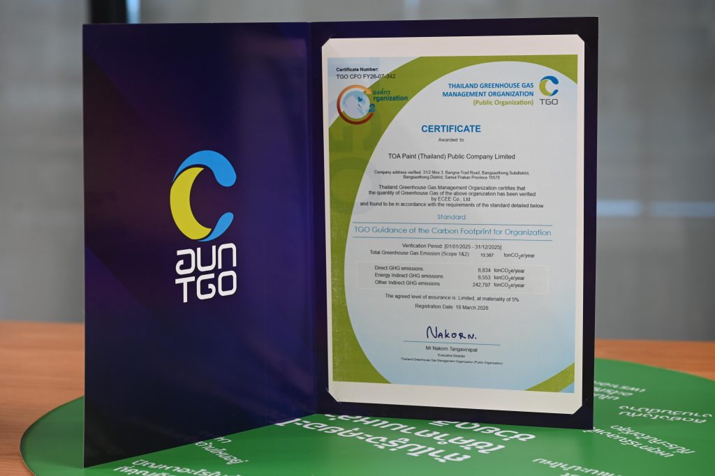 ล่าสุด ! ได้รับประกาศนียบัตร ‘การรับรองคาร์บอนฟุตพริ้นท์ขององค์กร (Carbon Footprint for Organization: CFO)’ โดยมี นายจตุภัทร์ ตั้งคารวคุณ ประธานเจ้าหน้าที่บริหาร TOA เข้ารับมอบประกาศนียบัตรจาก ดร.วิจารย์ สิมาฉายา ประธานกรรมการองค์การบริหารจัดการก๊าซเรือนกระจก (องค์การมหาชน) หรือ อบก. และมี นายณกรณ์ ตรรกวิรพัท ผู้อำนวยการ อบก. ร่วมแสดงความยินดี ณ สถาบันเพื่อการยุติธรรมแห่งประเทศไทย หรือ TIJ