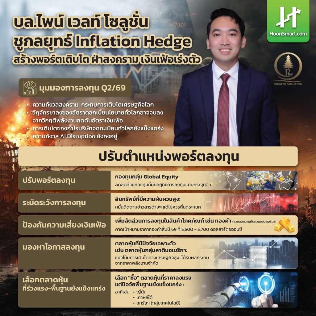 HoonSmart.com>>”บล.ไพน์ เวลท์ โซลูชั่น” แนะลดความผันผวนพอร์ตลงทุน ด้วยกลยุทธ์ Inflation Hedge ฝ่าสงครามตะวันออกกลาง เงินเฟ้อเร่งตัว ชู “ทองคำ” ยังน่าสนใจ คาดราคาปีนี้ 5,700 เหรียญสหรัฐ/ออนซ์ มอง “ตลาดหุ้นละตินอเมริกา-เอเชียเหนือ” เด่น กระจายลงทุน “หุ้นสหรัฐฯ (ดัชนี S&P500)-ยุโรป-ญี่ปุ่น-เวียดนาม” พร้อมตราสารหนี้คุณภาพดีทั่วโลกเสริมพอร์ตแกร่ง