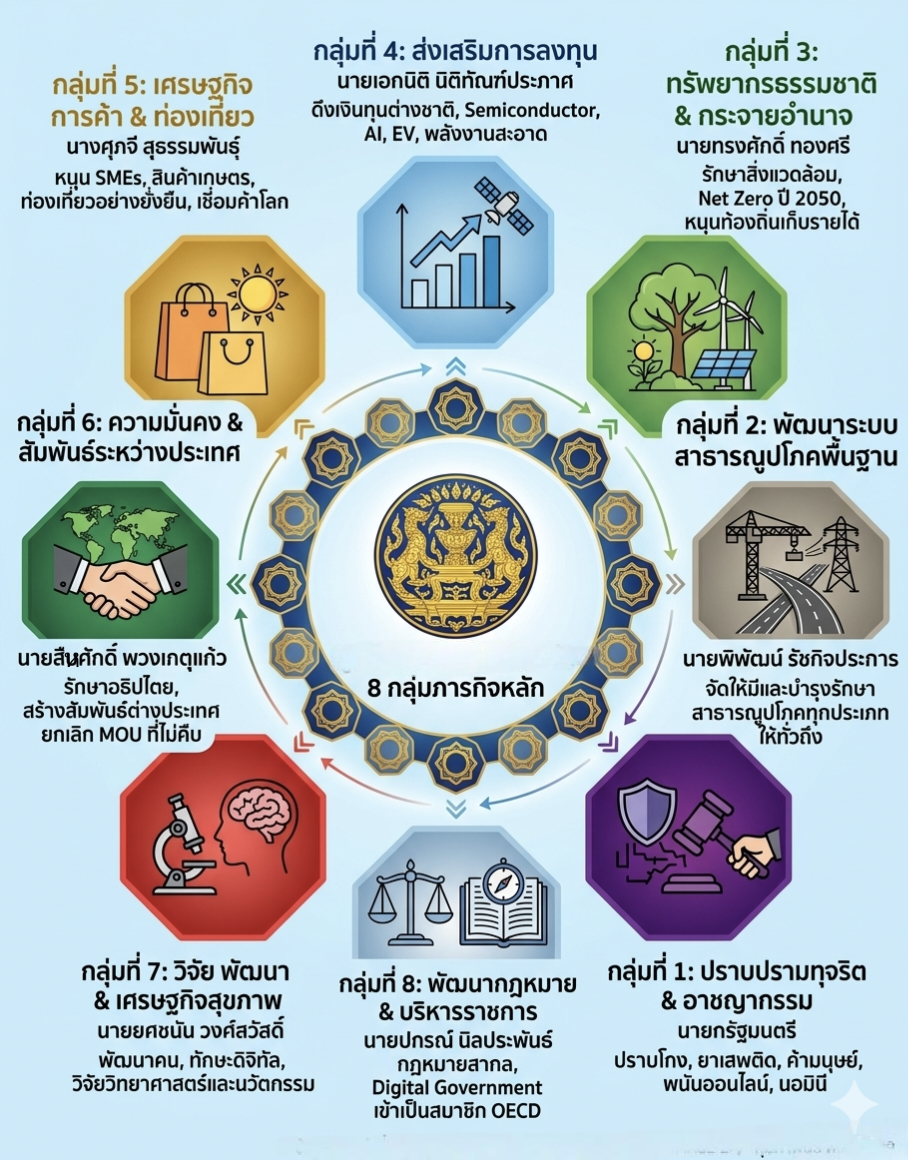 4. “กลุ่มภารกิจส่งเสริมการลงทุน” นายเอกนิติ นิติทัณฑ์ประภาศ รองนายกรัฐมนตรี ได้รับมอบหมายให้เข้าคุมพอร์ตโฟลิโอเศรษฐกิจ โดยมุ่งเน้นการอำนวยความสะดวกแก่การลงทุนโดยตรงจากต่างประเทศ (Foreign Direct Investment – FDI) ในกลุ่มอุตสาหกรรมยุทธศาสตร์ ได้แก่ Tech Ecosystem เซมิคอนดักเตอร์ (Semiconductor), ปัญญาประดิษฐ์ (AI), โรโบติกส์ และดิจิทัล และ Green & Health พลังงานสะอาด, ยานยนต์สมัยใหม่ และอุตสาหกรรมการแพทย์และเวชภัณฑ์ ซึ่งเป็นอุตสาหกรรมเป้าหมายหลัก