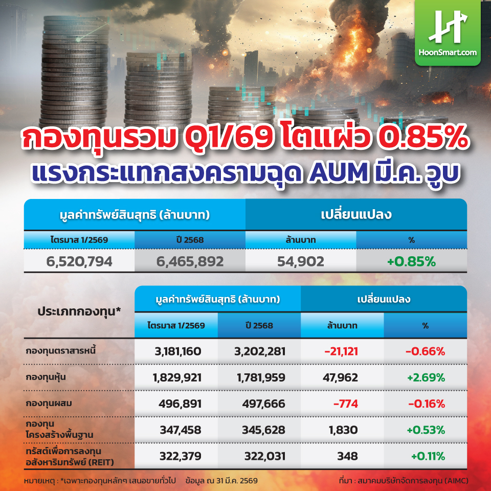 HoonSmart.com>>”กองทุนรวม” ถูกแรงกดดันจากสงครามฉุด มูลค่า AUM เดือนมี.ค.วูบ 1.8 แสนล้านบาท ดึงภาพรวม Q1/69 โตแผ่ว 0.85% อยู่ที่ 6.52 ล้านล้านบาท เพิ่มขึ้น 5.49 หมื่นล้านบาท จากสิ้นปี 68 “กองทุนหุ้น” มูลค่าเพิ่มขึ้น สวนทาง “กองทุนตราสารหนี้” ลดลง ด้านบลจ.กสิกรไทย ยังครองแชมป์บริหารเงินสูงสุด 1.46 ล้านล้านบาท ฟาก “บลจ.ดาโอ” โตสูงสุด 36.78%