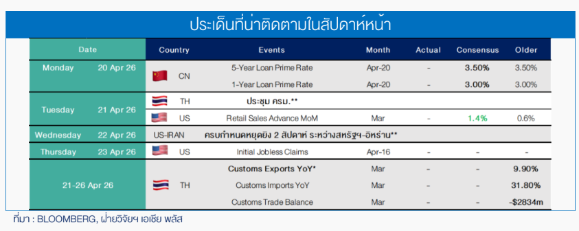 (ประเด็นการลงทุนต่างประเทศเพิ่มเติม: แนะนำเก็งกำไร DR: ANTA23 หลังยอดขายเสื้อผ้ากีฬาในจีนเดือน มี.ค. เติบโตสวนกระแสสินค้ากลุ่มอื่นถึง +9% YoY โดยแบรนด์ในเครือ ANTA ทำผลงานโดดเด่นเอาชนะคู่แข่งต่างชาติอย่าง Nike และ Asics ที่มียอดขายหดตัว นอกจากนี้จับตาหุ้น NETFLIX (NFLX US) ที่แม้จะรายงานรายได้และกำไรไตรมาส 1 สูงกว่าคาด แต่ราคาหุ้นร่วงลง -9% ในช่วง After-hours หลังให้คาดการณ์รายได้ไตรมาส 2 ต่ำกว่าที่ตลาดคาดไว้)