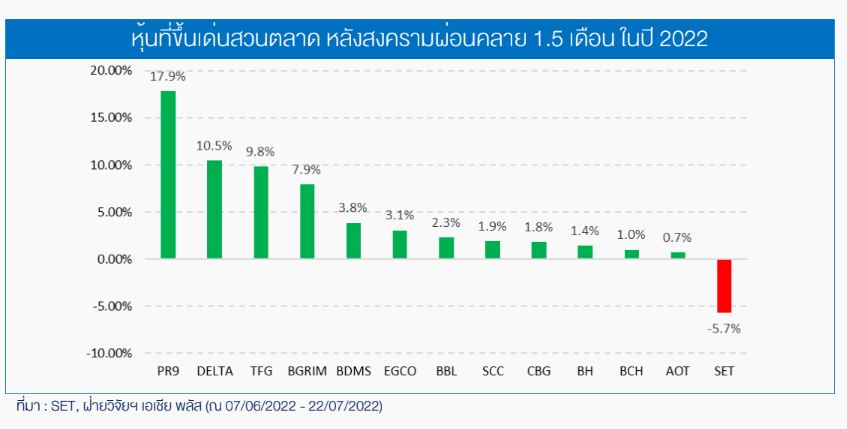 บล.เอเซีย พลัส แนะนำกลยุทธ์เก็งกำไรใน “หุ้นที่มักปรับตัวขึ้นเด่นสวนตลาดเวลาสงครามผ่อนคลาย” (อ้างอิงสถิติปี 2022) ได้แก่ PR9, DELTA, TFG, BGRIM, BDMS, EGCO, BBL, SCC, CBG, BH, BCH และ AOT โดยมีหุ้นเด่น (Prime Picks) ประจำวันคือ COM7, ICHI และ PR9